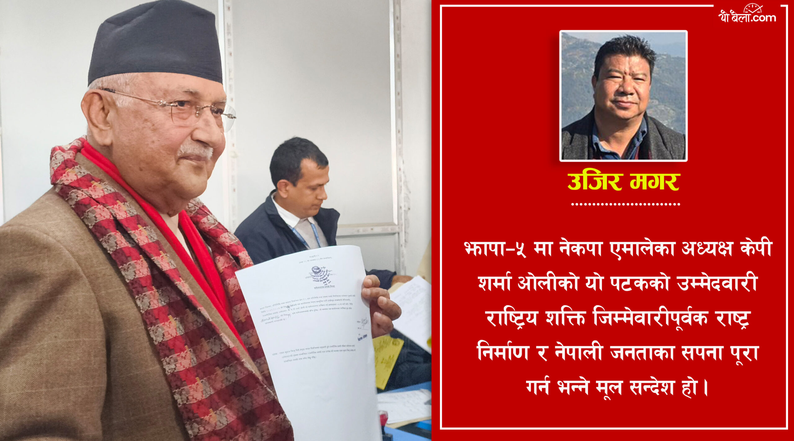 दमक-नेकपा एमालेका केन्द्रीय सदस्य एवं पाँचथरका उम्मेद्वार आइन्द्रसुन्द नेम्वाङले देशको अस्तित्व रक्षाका लागि यस पटककको चुनाव महत्वपूर्ण भएकोले एमालेले मतदान गर्न सबैमा आग्रह गर्नुभएको छ । विदेशी शक्ती हाबी भएका कारण एमालेले उठाएका राष्ट्रियता,स्वाभिमानका मुद्धा कमजोर पार्न प्रयास चौतर्फी भएको