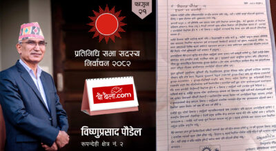 बुटवल- प्रतिनिधि सभा सदस्य निर्वाचन अन्तर्गत रूपन्देही निर्वाचन क्षेत्र-२ का उम्मेदवार विष्णुप्रसाद पौडेल ले मतदातालाई हस्तलिखित पत्रबाटै सम्बोधन गर्दै विकास–समृद्धिलाई