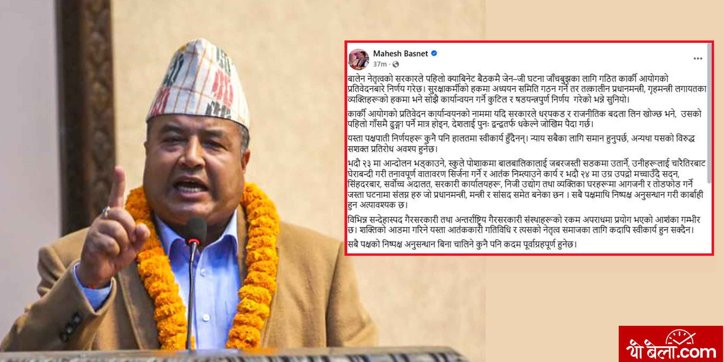 भक्तपुर- नेकपा एमालेका सचिव महेश बस्नेतले गौरीबहादुर कार्की आयोग कार्यान्वयन गर्ने सरकारको कुटिल र षडयन्त्रपूर्ण निर्णयले देशलाई द्वन्द्वतर्फ धकेल्ने बताएका छन्। सरकारले कार्की आयोगको प्रतिवेदन कार्यन्यवनका लागि सुरक्षाकर्मीको हकमा अर्को कार्यदल बनाएर अध्ययन गर्ने तर राजनीतिक व्यक्तिलाई कारबाही अघि बढाउने