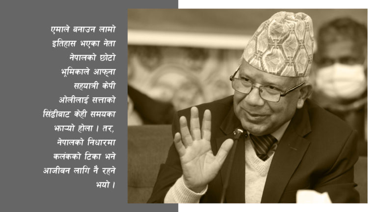 एमाले बनाउन लामो इतिहास भएका नेता नेपालको छोटो भूमिकाले आफ्ना सहयात्री केपी ओलीलाई सत्ताको सिंढीबाट केही समयका झार्यो होला तर नेपालको निधारमा कलंकको टिका भने आजीवन लागि नै रहनेभयो ।