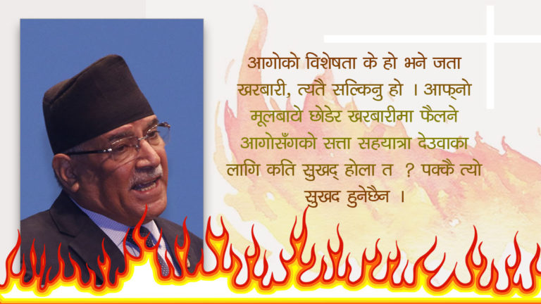 दाहालले आफूलाई आगोसँग तुलना गरेर देउवासँग महत्वपूर्ण मन्त्रालयको बार्गेनिङ मात्र गर्नुभएको होइन नियुक्ति, आफ्नो टाउकोमा भएको द्वन्द्वकालिन मुद्दाको बोझिलो भारीबाट मुक्ति दिलाउन थप दबाब कस्नु भएको छ । आगोको विशेषता के हो भने जता खरबारी, त्यतै सल्किनु हो । आफ्नो मूलबाटो छोडेर खरबारीमा फैलने आगोसँगको सत्ता सहयात्रा देउवाका लागि कति सुखद् होला त ? पक्कै त्यो सुखद हुनेछैन ।