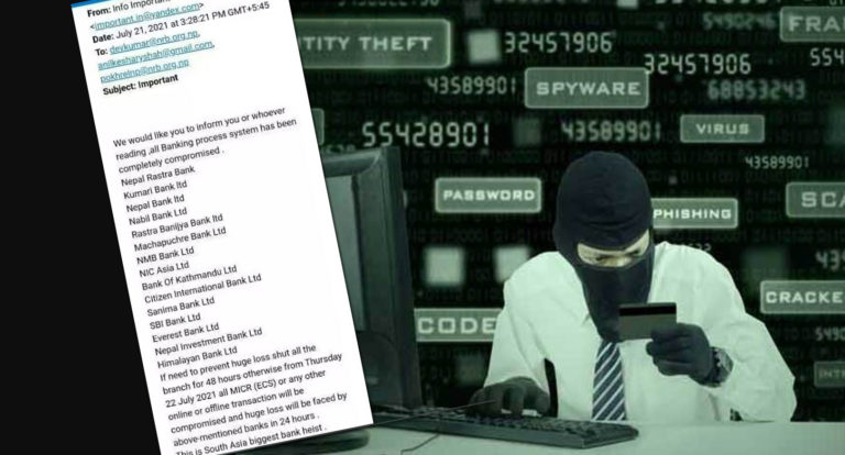 काठमाडौँ- यतिखेर बैंकिङ्ग क्षेत्रमा ह्याकरको एउटा इमेलले आतंक नै मच्चाएको छ । नेपाल राष्ट्र बैंकसहित १५ वटा बैंकको सिस्टम ह्याक गरिसकेको र ठूलो मात्रामा पैसा चोरी गर्ने भन्दै इमेल र फोन आएपछि राष्ट्र बैंकले यसबारे अनुसन्धान थालेको छ । साथै नाम उल्लेख गरिएका बैंकहरुले रातभर कर्मचारी खटाएरै सिस्टम निगरानी बढाएका छन् ।