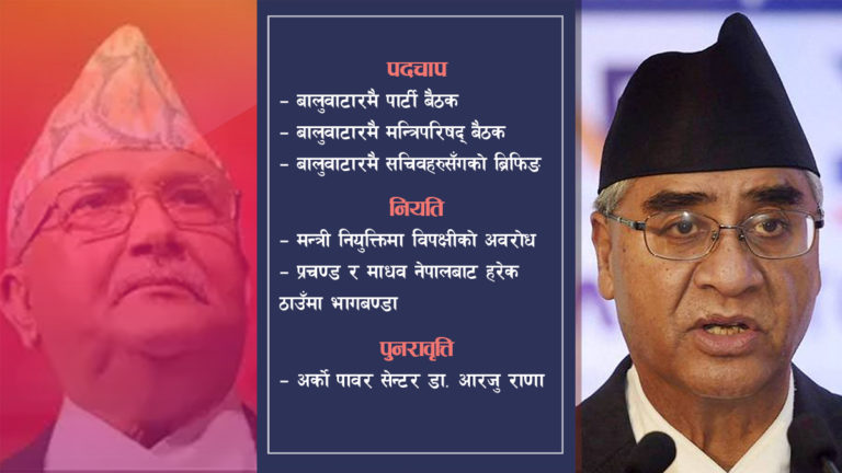 दुई साता नबित्दै देउवाको पाँचौ कार्यकाल स्मरणीय बनाउनेभन्दा पनि अघिल्ला प्रधानमन्त्री केपी शर्मा ओलीकै नियति र पदचाप पछ्याउनुपर्ने अवस्था आएको छ ।