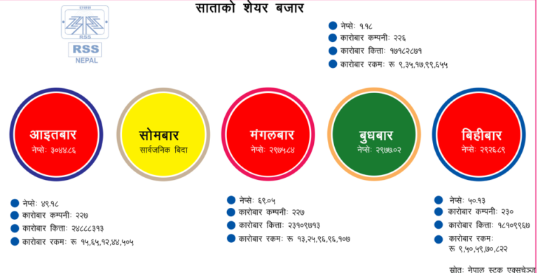 यस साता कूल चार दिन शेयर कारोबार भयो । सोमबार सार्वजनिक बिदा परेकाले कारोबार भएन । साताको पहिलो दिन निर्जीवन बीमा, जीवन बीमा, लघुवित्त र जलविद्युत् उपसमूहको शेयर मूल्य उच्च अङ्कले ओरालो लागेपछि धितोपत्र बजारमा शेयर कारोबार मापक नेप्से परिसूचक दोहोरो अङ्कले ओरालो लाग्यो ।