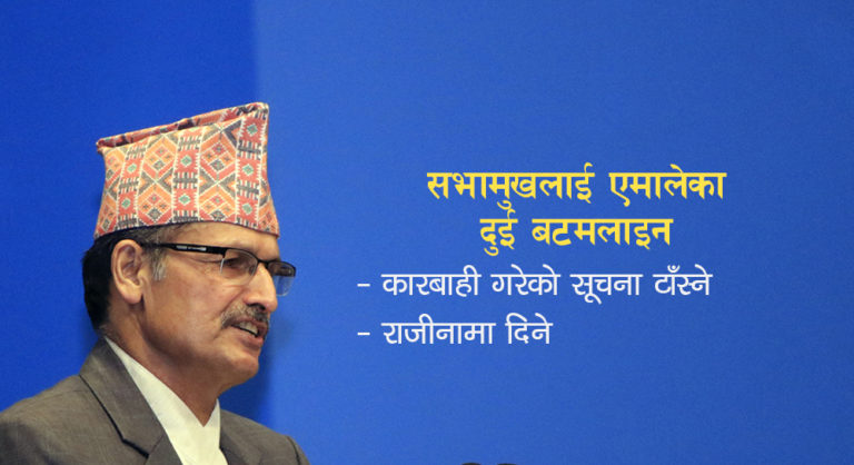 एमालेले सभामुखले जहाँबाट गल्ती गरेका हुन्, त्यहीँ फर्केर सच्याउनुपर्ने बटमलाइन सार्वजनिक गरेको छ । एमाले प्रवक्ता प्रदीप ज्ञवालीका अनुसार सभामुखलाई एमालेले पत्र पठाउँदै भनेको छ, ‘कि सूचना टाँस्नुस्, हैन भने अब मार्ग प्रशस्त गर्नोस् ।’