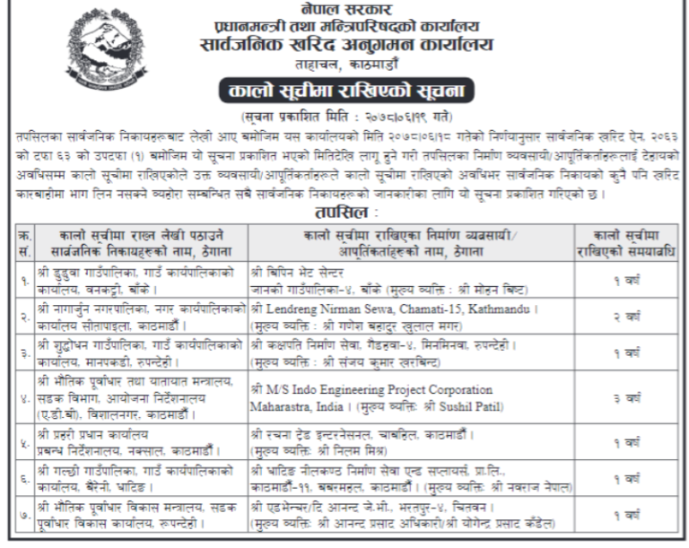 कालोसूचीमा पर्नेमा बाँकेको विपिन भेट सेन्टर, काठमाडौंको ल्यान्ड्रिङ निर्माण सेवा, रुपन्देहीको कक्षपति निर्माण सेवा, भारतको महाराष्ट्रको एमएस इन्डो इन्जिनियरिङ प्रोजेक्ट कर्पाेरेसन, काठमाडौंको रचना ट्रेड इन्टरनेसनल, काठमाडौंकै धादिङ नीलकण्ठ निर्माण सेवा एण्ड सप्लायर्स र भरतपुरको एडभेन्चर/दि आनन्द जेभी रहेका छन् ।