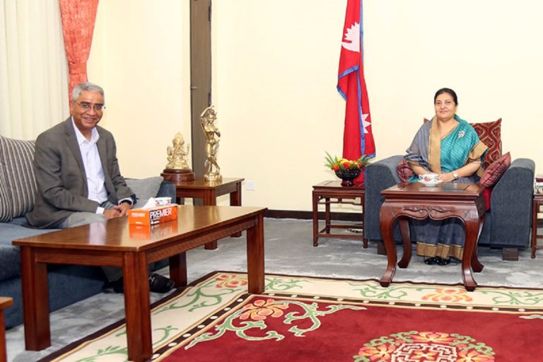 काठमाडौं- प्रधानमन्त्री शेरबहादुर देउवाले राष्ट्रपति विद्यादेवी भण्डारीलाई शीतल निवास पुगेर भेट गर्नुभएको छ ।