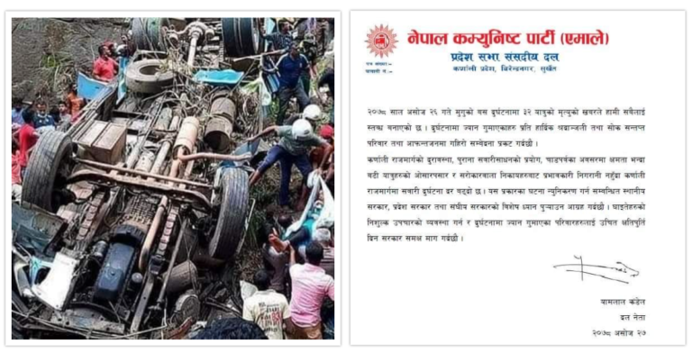 सुर्खेत– नेकपा एमाले कर्णाली प्रदेशसभा दलले मुगु दुर्घटनाका घाइतेको निःशुल्क उपचार र मृतकका परिवारलाई क्षतिपूर्तिको माग गरेको छ ।