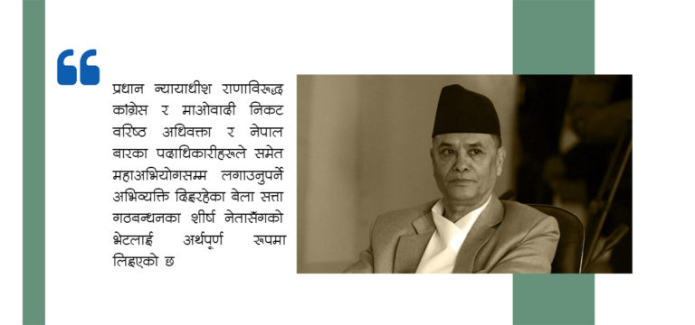 प्रधान न्यायाधीश राणाविरुद्ध कांग्रेस र माओवादी निकट वरिष्ठ अधिवक्ता र नेपाल बारका पदाधिकारीहरुले समेत महाअभियोगसम्म लगाउनुपर्ने अभिव्यक्ति दिइरहेका बेला सत्ता गठबन्धनका शीर्ष नेतासँगको भेटलाई अर्थपूर्ण रुपमा लिइएको छ ।