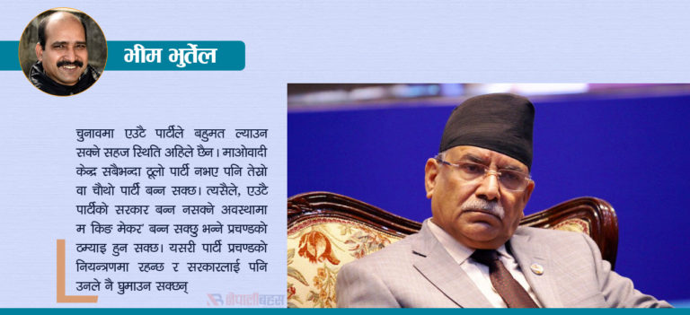चुनावमा एउटै पार्टीले बहुमत ल्याउन सक्ने सहज स्थिति अहिले छैन। माओवादी केन्द्र सबैभन्दा ठूलो पार्टी नभए पनि तेस्रो वा चौथो पार्टी बन्न सक्छ। त्यसैले, एउटै पार्टीको सरकार बन्न नसक्ने अवस्थामा म ‘किङ मेकर’ बन्न सक्छु भन्ने प्रचण्डको ठम्याइँ हुन सक्छ। यसरी पार्टी प्रचण्डको नियन्त्रणमा रहन्छ र सरकारलाई पनि उनले नै घुमाउन सक्छन्