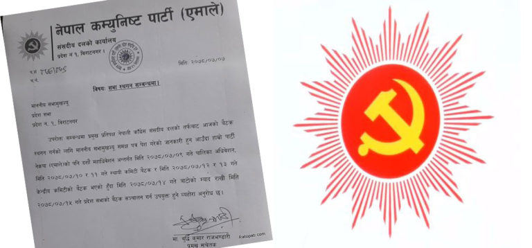 एमालेका प्रमुख सचेत बुद्धिकुमार राजभण्डारीले सभामुखलाई सम्बोधन गरी बुझाएको पत्रमा १५ कात्तिकसम्म प्रदेशसभा बैठक स्थगित गर्न माग गरिएको छ ।