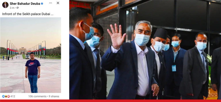 प्रधानमन्त्री देउवाको फेसबुकबाट प्रहरी नायब निरीक्षक धितालले ‘इन्फ्रन्ट अफ शेख प्यालेस दुबई’ लेखेर आफ्नो फोटो पोष्ट गरेका छन् । उनले सो पोष्ट केहीबेरमा हटाए ।