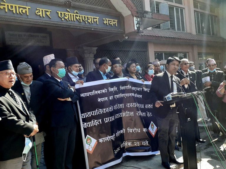 काठमाडौं – प्रधानन्यायाधीश चोलेन्द्र शमशेर जबराको राजीनामा माग्दै नेपाल बार एसोसिएसनको व्यानरमा मंगलवार पनि सर्वोच्च अदालत परिसरमा विरोध र कोणसभा भएको छ ।