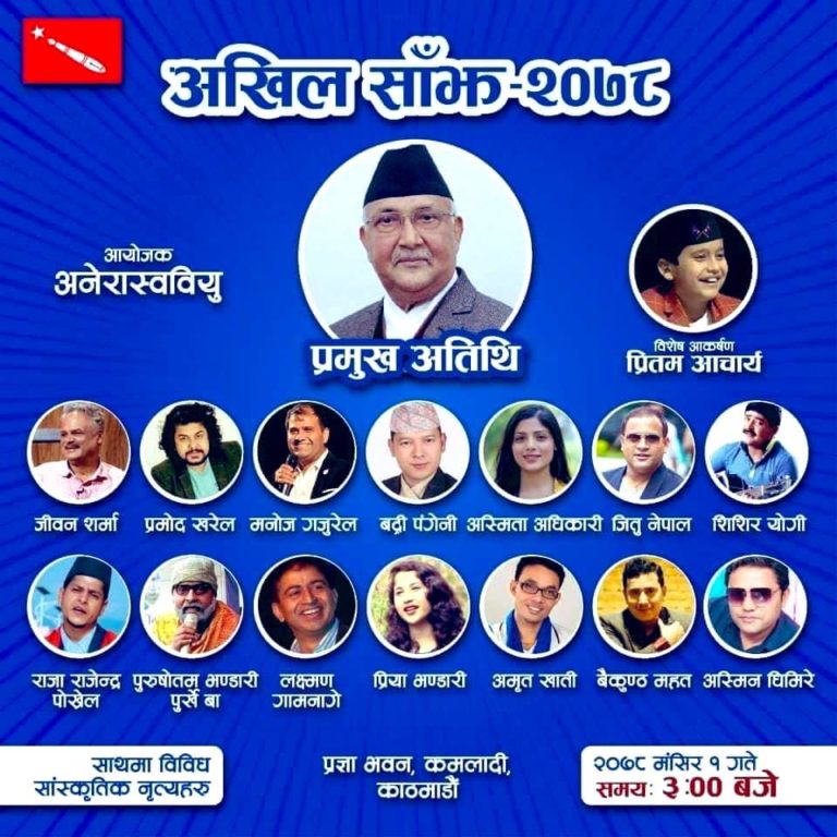काठमाडौं -नेकपा एमाले निकट विद्यार्थी सङ्गठन अनेरास्ववियुले आज विभिन्न चाडपर्व र पार्टीको दशौँ राष्ट्रिय महाधिवेशनको पूर्वसन्ध्यामा अखिल शुभकामना साँझ आयोजना गर्दैछ । सोकार्यक्रमको उद्धघाटन अध्यक्ष केपी शर्मा ओलीले गर्नुहुनेछ ।