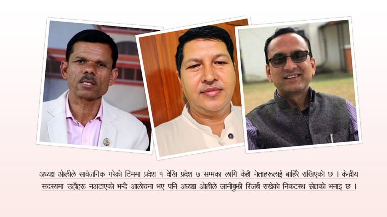 अध्यक्ष ओलीले सार्वजनिक गरेको टिममा प्रदेश १ देखि प्रदेश ७ सम्मका लागि केही नेताहरुलाई राखिएको छ । केन्द्रीय सदस्यमा उहाँहरु नअटाएको भन्दै आलोचना भए पनि अध्यक्ष ओलीले जानीबुझी रिजर्ब राखेको निकटस्थ स्रोतको भनाइ छ ।