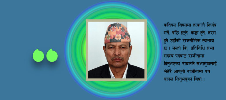 कतिपय विषयमा तत्कालै निर्णय गर्ने, पछि हट्ने, कडा हुने, नरम हुने उहाँको राजनीतिक स्वभाव छ । जस्तो कि, प्रतिनिधि सभा सदस्य पदबाट राजीनामा दिनुभएका रावलले सभामुखलाई भेटेरै आफ्नो राजीनामा पत्र वापस लिनुभएको थियो ।