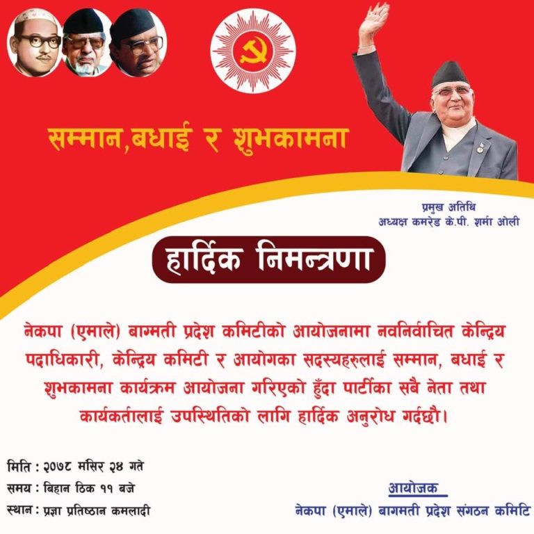 काठमाडौं – नेकपा एमालेको दशौं महाधिवेशनबाट निर्वाचित केन्द्रीय पदाधिकारी र सदस्यहरुलाई बागमती प्रदेश कमिटीले आज बधाइ,सम्मान र शुभकामना दिने कार्यक्रम राखेको छ ।।