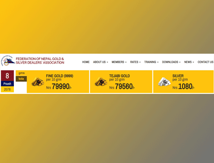 आज छापावाल सुन प्रति १० ग्राम ७९ हजार ९९० रुपैयाँ कायम भएको महासंघले जनाएको छ । त्यसैगरी, तेजाबी सुन प्रतितोला ९२ हजार ८०० रुपैयाँ कायम भएको छ । त्यस्तै, तेजाबी सुन प्रति १० ग्राम ७९ हजार ६० रुपैयाँ कायम भएको महसंघले जनाएको छ ।