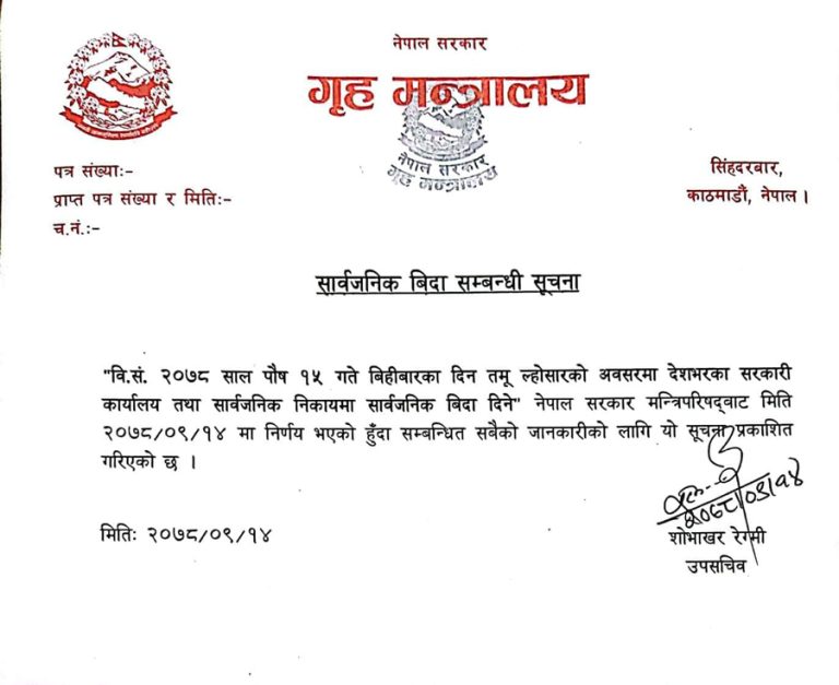 गृह मन्त्रालयले बुधबार विज्ञप्ति जारी गर्दै तमु ल्होसारमा देशभरका सरकारी कार्यालय तथा सार्वजनिक निकायमा सार्वजनिक बिदा दिइएको जनाएको छ ।