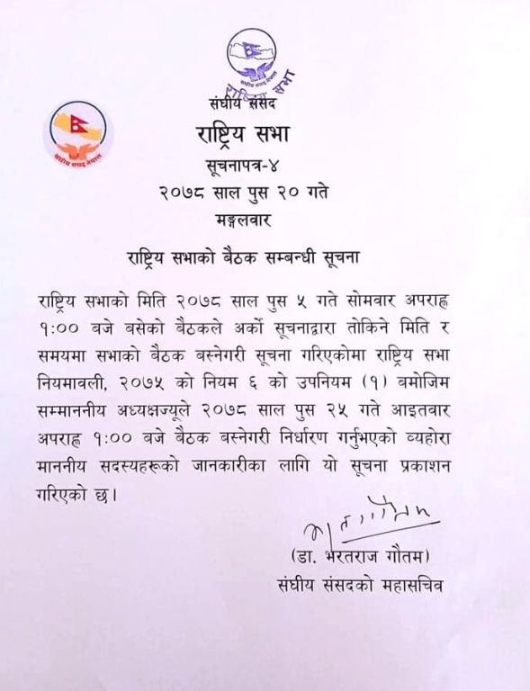 यसअघि ५ पुसमा बसेको बैठकले अर्को सूचना जारी बैठकको मिति र समय पछि तोक्ने उल्लेख गरेकाले सोहीअनुसार राष्ट्रिय सभाका अध्यक्ष गणेश तिमिल्सिनाले २५ पुसमा बैठक बस्ने गरी मिति तोकेका हुन्।