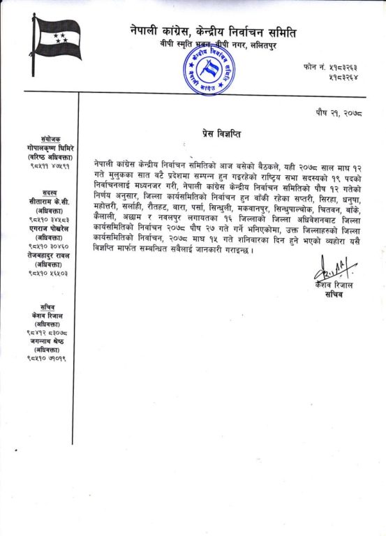 कांग्रेस केन्द्रीय निर्वाचन समितिको बुधबार बिहान बसेको बैठकले राष्ट्रिय सभाको निर्वाचनलाई कारण देखाउँदै २७ पुसमा तय भएको अधिवेशनको मिति सारेको हो । नयाँ निर्णयअनुसार अब १५ माघका लागि अधिवेशनको मिति तोकिएको छ ।