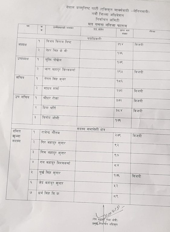 अध्यक्षका अर्का प्रतिस्पर्धी नेहरसिंह केसीले १७६ मत पाए । पदाधिकारीमध्ये उपाध्यक्षमा झगबहादुर विश्वकर्मा, सचिवमा माधव शर्मा तथा दुई सहसचिवमा श्रीधर रोका र दीपा घर्ती विजयी भएका छन् । अध्यक्षमा विजयी विष्ट वामदेव गौतम निकट हुन् ।