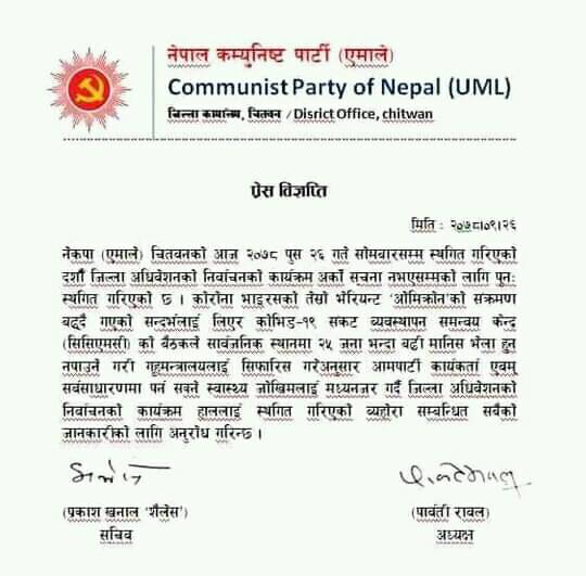 चितवन – नेकपा एमाले चितवनको १०औँ अधिवेशन अनिश्चितकालका लागि स्थगित भएको छ । कोरोना महामारीको तेस्रो लहर (ओमिक्रोन) बढ्दै गएको भन्दै अधिवेशन अनिश्चितकालका लागि स्थगन भएको हो।