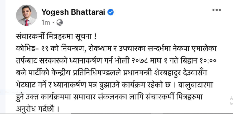 नेकपा एमालेका सचिव योगेश भट्टराईले माघ १ गते बिहान १० बजे पार्टीको केन्द्रीय प्रतिनिधि मण्डलले प्रधानमन्त्री देउवासँग भेटवार्ता गर्ने कार्यक्रम रहेको बताउनुभएको छ । उहाँले भेटका क्रममा प्रधानमन्त्री देउवालाई कोरोना नियन्त्रणका बारेमा ध्यानाकर्षण पत्र बुझाइने कार्यक्रम रहेको जानकारी दिनुभयो ।