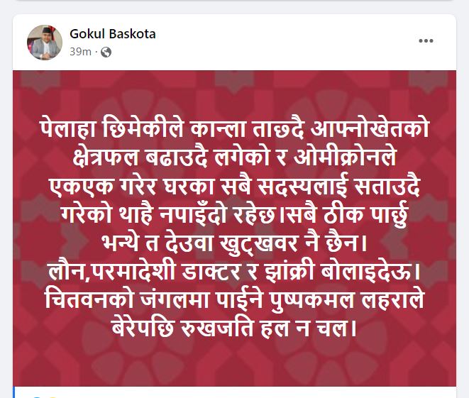 व्यंग्यात्मक शैलीमा बास्कोटाले फेसबुकमा लेख्नुभएको छ, ‘पेलाहा छिमेकीले कान्ला ताछ्दै आफ्नोखेतको क्षेत्रफल बढाउँदै लगेको र ओमिक्रोनले एकएक गरेर घरका सबै सदस्यलाई सताउँदै गरेको थाहै नपाइॅंदो रहेछ। सबै ठीक पार्छु भन्थे त देउवा खुट्खवर नै छैन। लौन परमादेशी डाक्टर र झाँक्री बोलाइदेऊ। चितवनको जंगलमा पाइने पुष्पकमल लहराले बेरेपछि रुखजति हल न चल ।’