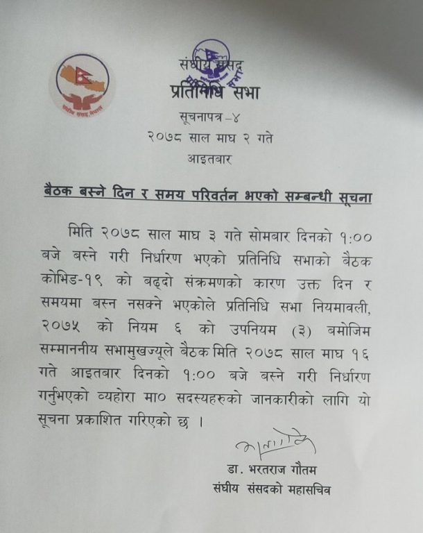 काठमाडौं – प्रतिनिधि सभाको बैठक माघ १६ गतेसम्मका लागि स्थगित भएको छ । यसअघि माघ ३ गते सोमबार १ बस्नेगरी बोलाइएको प्रतिनिधि सभाको बैठक कोरोनाको कारण देखाउँदै माघ १६ गते बस्ने गरी स्थगित भएको हो ।