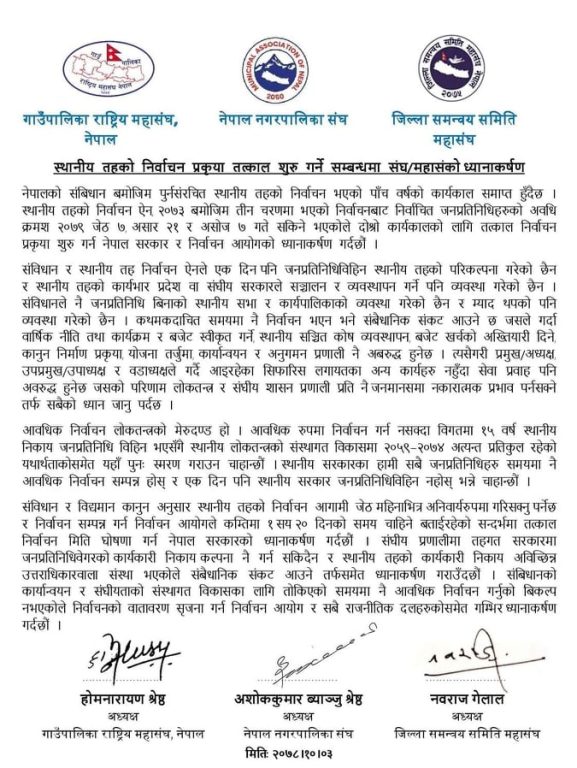 नगरपालिका संघ, गाउँपालिका राष्ट्रिय महासंघ र जिल्ला समन्वय समिति महासंघले आज संयुक्त विज्ञप्ती निकालेर यस्तो चेतावनी दिएका हुन् । ‘संविधानले स्थानीय तहलाई एक दिन पनि जनप्रतिनिधिविहिन हुने कल्पना नगरेकोले आगामी जेठ भित्र स्थानीय तहको निर्वाचन सम्पन्न गर्न हामी सरकारलाई स्मरण गराउँदछौं’ नगरपालिका महासंघका अध्यक्ष अशोक व्याञ्जु, गाउँपालिका महासंघका अध्यक्ष होमनारयाण श्रेष्ठ र जिसस महासंघका अध्यक्ष नवराज गेलालले जारी गरेको विज्ञप्तीमा भनिएको छ ।