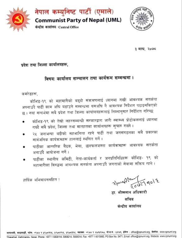 कार्यालय सचिव डा. भिष्म अधिकारीले जारी गरेको चार बुँदे सर्कुलरमा स्वास्थ्य प्रोटोकललाई ख्याल गर्दै सबै प्रदेश र जिल्ला कार्यलयहरु सञ्चालन गर्न निर्देशन गरिएको छ । यसैगरी पार्टीका आन्तरिक बैठक,छलफल,भेला जस्ता कार्यक्रमहरु आवश्यक सतर्कता अपनाएर निरन्तर सुचारु गर्न भनिएको छ । यसैगरी २५ जना भन्दा सहभागी हुनुपर्ने कार्यक्रमहरु हाललाई स्थगित गर्न पार्टीले निर्देशन पठाएको छ ।