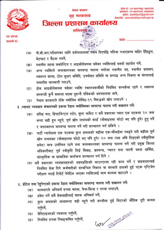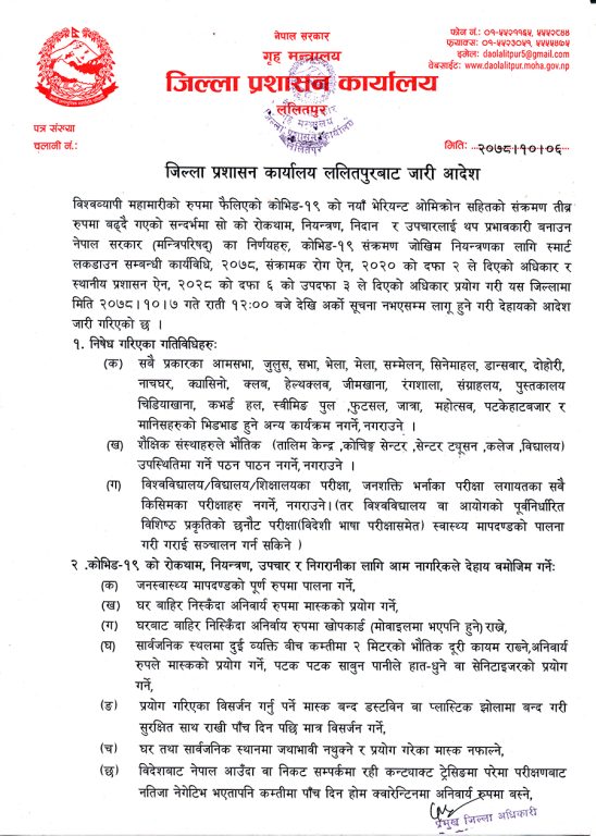 उपत्यकाका तीनवटै जिल्लाका प्रमुख जिल्ला अधिकारीहरुको संयुक्त बैठकले गरेको निर्णयअनुसार जिल्ला प्रशासन कार्यालयहरुले आ–आफ्नो जिल्लामा छुट्टाछुट्टै आदेश जारी गरेका छन् ।