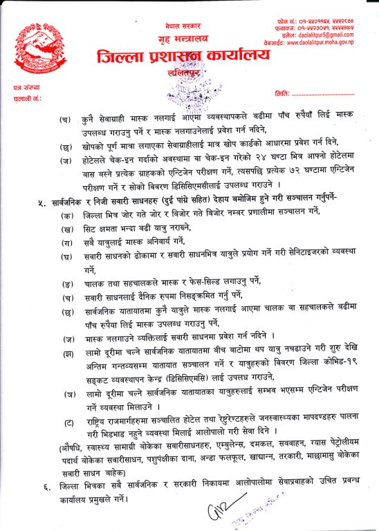 बैठकपछि ललितपुरका प्रमुख जिल्ला अधिकारी घनश्याम उपाध्यायले स्मार्ट लकडाउनको कार्यविधिअनुसार सार्वजनिक र निजी सवारी साधनहरुमा जोर बिजोर लागू गरिएको जानकारी दिनुभयो।