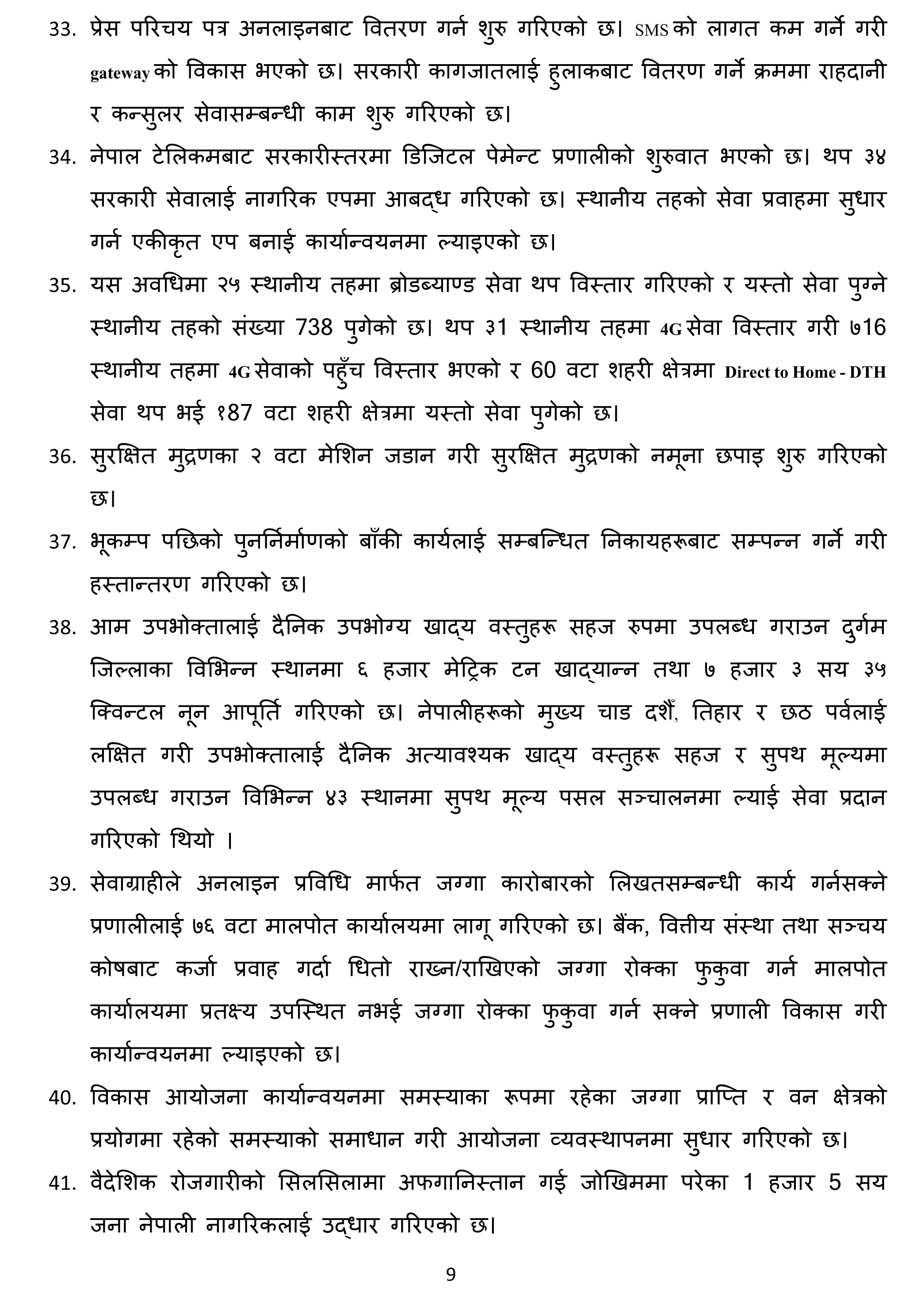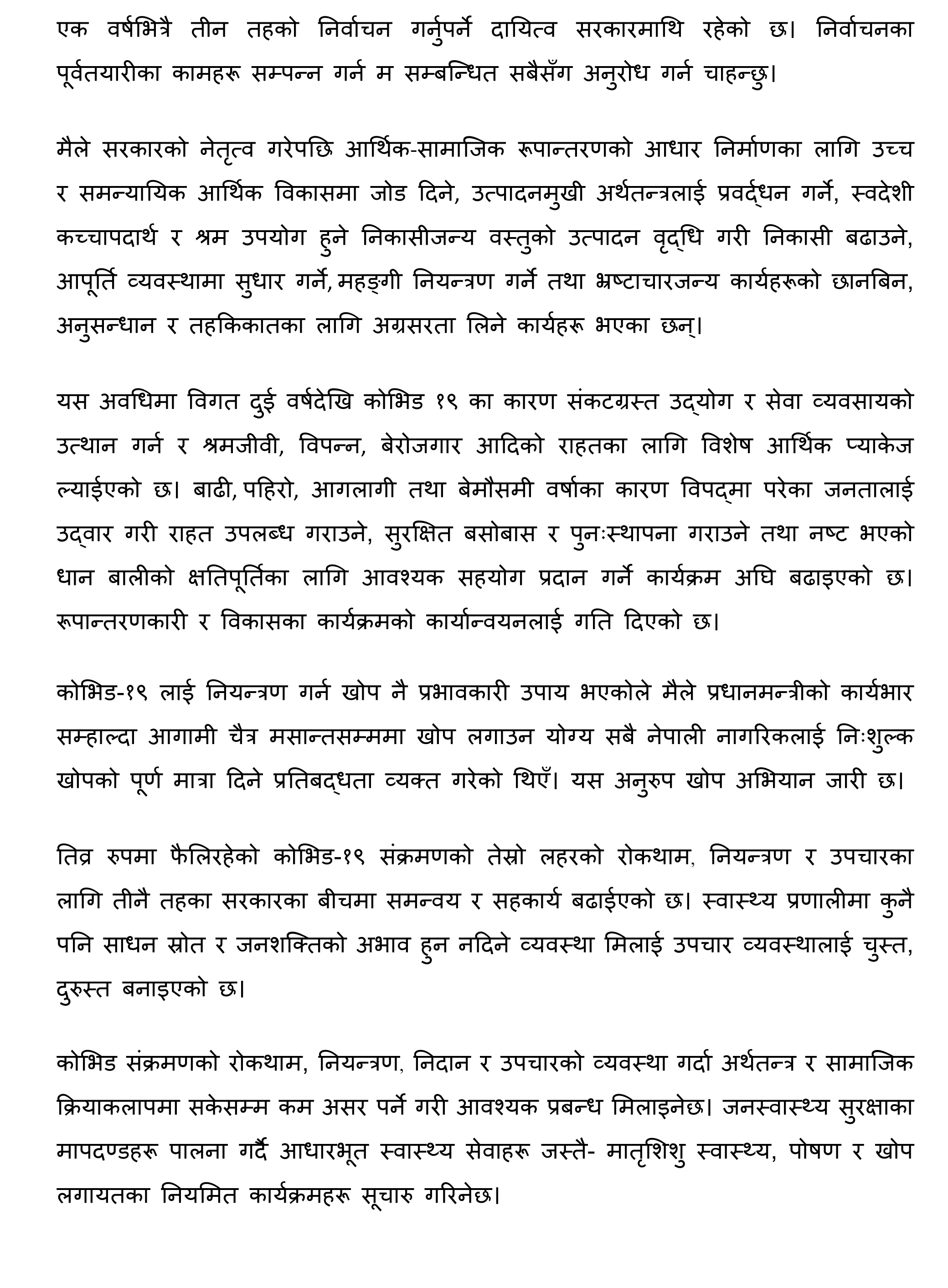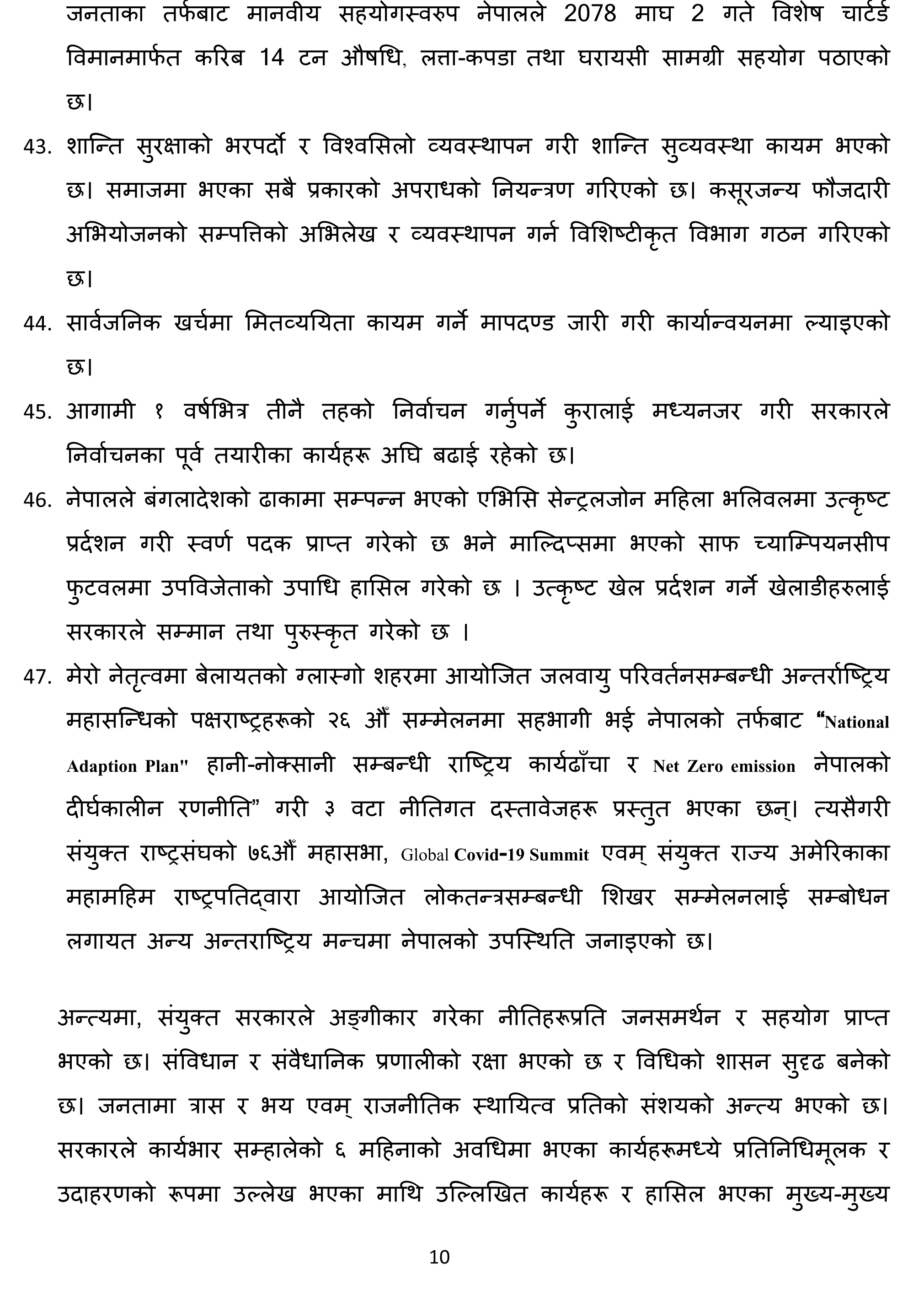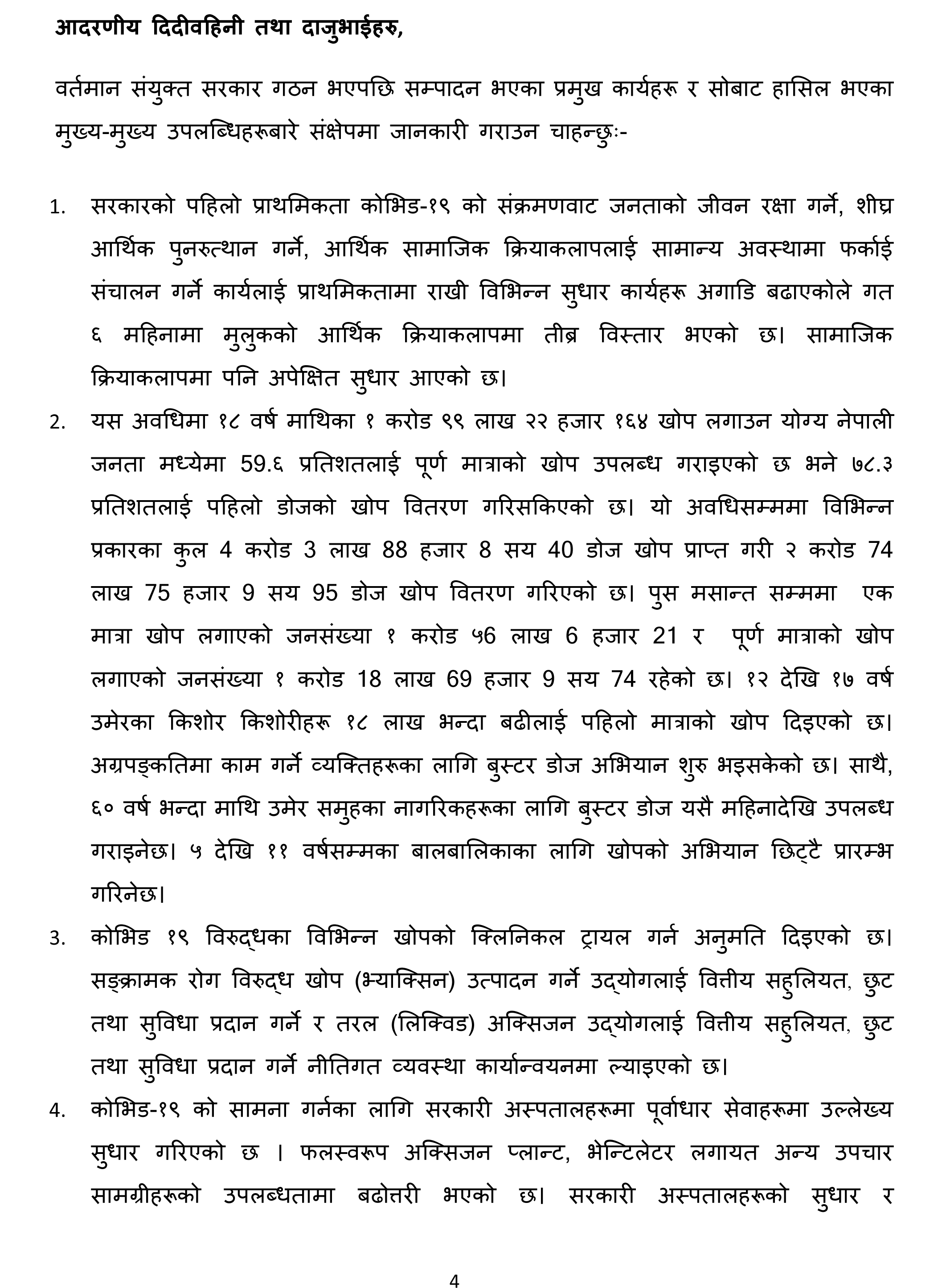 ४७ बुँदामा ६ महिनाको उपलब्धि सार्वजनिक गर्दै प्रधानमन्त्री देउवाले यसै महिनादेखि ६० वर्षमाथिका नागरिकलाई ‘बुस्टर डोज’ दिइने जानकारी दिनुभयो । उहाँले ८२ वटा झोलुंगे पुल र १७७ किलोमिटर सडक कालेपत्र गर्न सफल भएको पनि बताउनुभयो ।