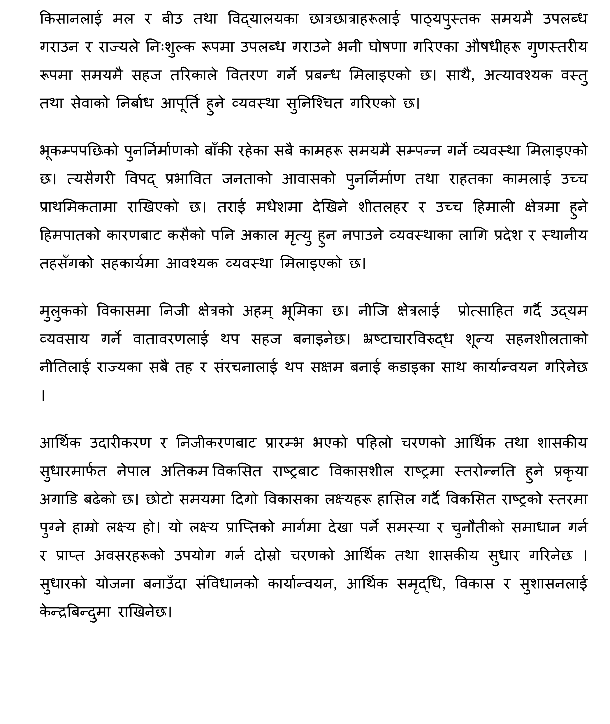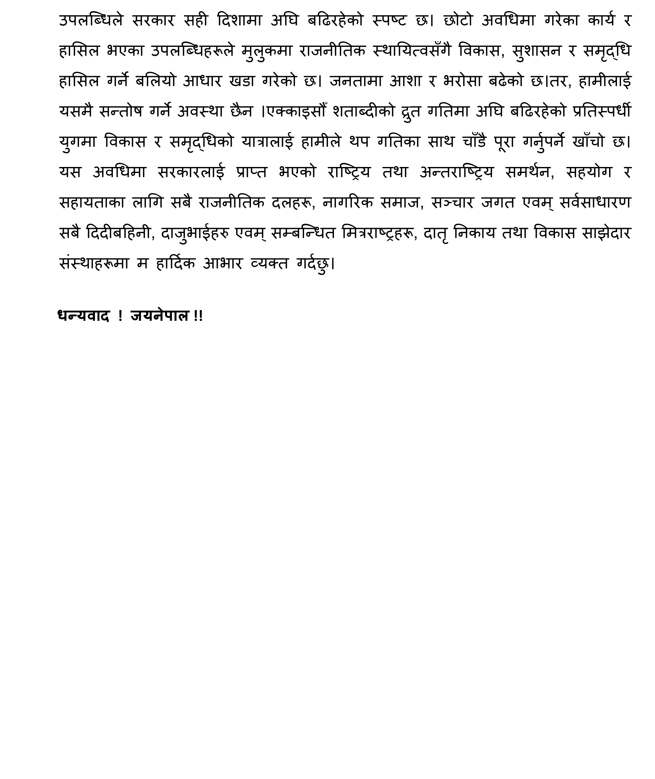 उहाँले एक वर्षभित्र मेलम्चीको खानेपानी काठमाडौंमा ल्याइने, जीटुजीको माध्यमबाट रासायनिक मल खरिद गरिने, धान र उखुको न्यूनतम समर्थन मूल्य तोकेकोलगायत विषयहरू उपलब्धिका रूपमा प्रस्तुत गर्नुभयो।