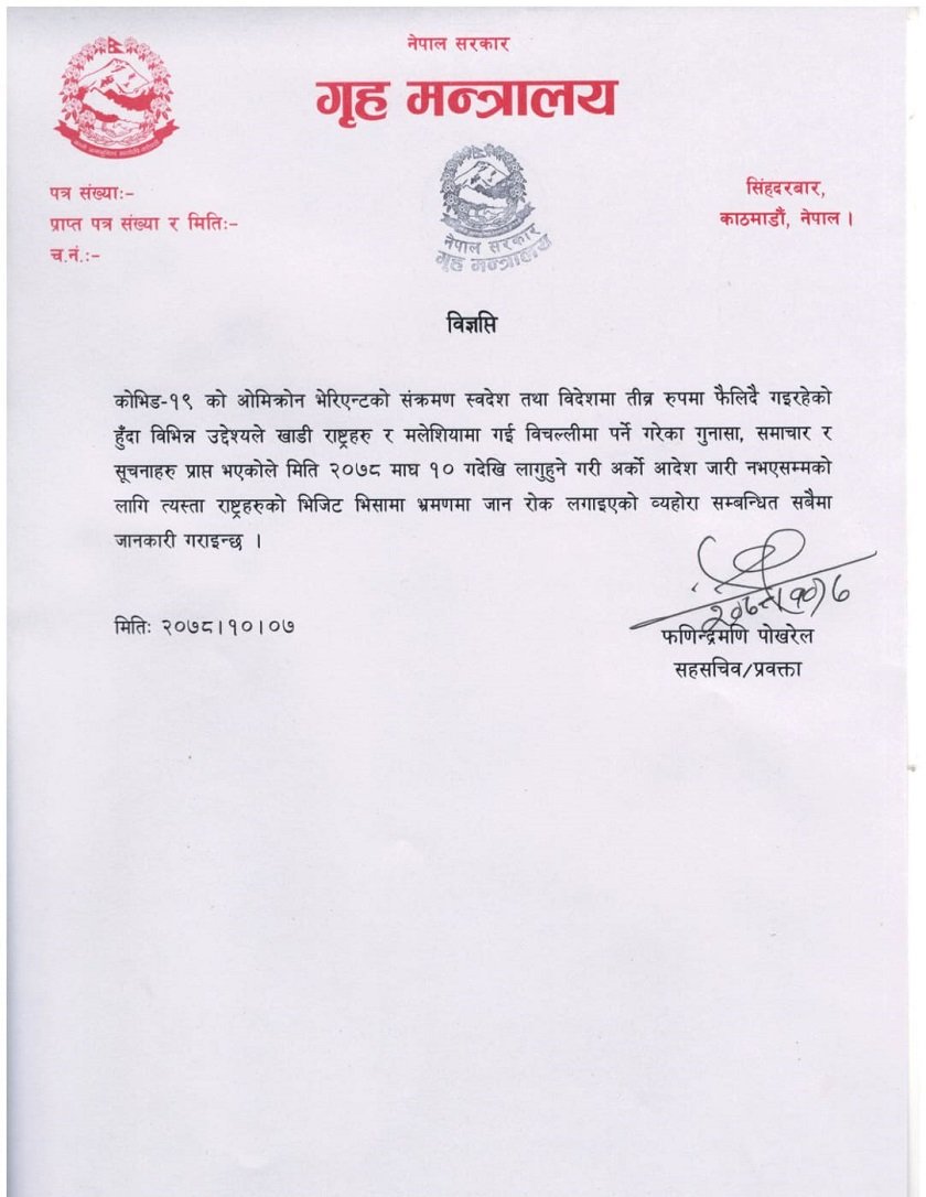 कोभिड-१९ को ओमिक्रोन भेरिएन्ट तीव्र रुपमा फैलिँदै गएको हुँदा मलेशियालगायत खाडी राष्ट्रमा गएका नागरिकहरू विचल्लीमा पर्ने गरेको गुनासो आएको भन्दै गृह मन्त्रालयले खाडी मुलुकको भ्रमणमा रोक लगाएको हो ।
