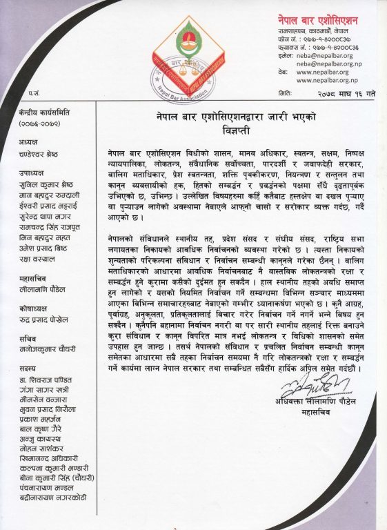 काठमाडौं – नेपाल बार एशोसिएशनले कुनै पनि बहानामा स्थानीय तहको निर्वाचन पर नसार्न आग्रह गरेको छ।