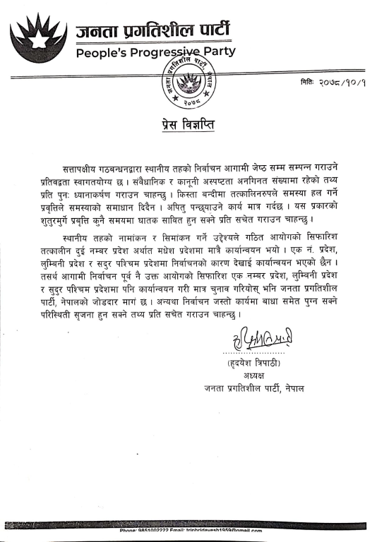 आगामी जेठमा निर्वाचन सम्पन्न गर्ने दलहरूको प्रतिबद्धता स्वागत योग्य रहेको बताउँदै त्रिपाठीले भन्नुभएको छ, ‘स्थानीय तहको नामांकन र सिमांकन गर्ने उद्देश्यले गठित आयोगको सिफारिस तत्कालीन प्रदेश २ अर्थात मधेश प्रदेशमा मात्रै कार्यान्वयन भयो । प्रदेश १, लुम्बिनी प्रदेश र सुदूपश्चिम प्रदेशमा निर्वाचनको कारण देखाई कार्यान्वयन भएको छैन । तसर्थ आगामी निर्वाचन पूर्व नै उक्त आयोगको सिफारिश प्रदेश १, लुम्बिनी प्रदेश र सुदूरपश्चिम प्रदेशमा पनि कार्यान्वयन गरी मात्र चुनाव गरियोस् भनी जनता प्रगतिशील पार्टी नेपालको जोडदार माग छ ।’