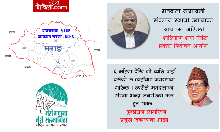 काठमाडौं – मनाङमा जनसंख्या भन्दा बढी मतदाता भन्ने राष्ट्रिय समाचार समितीमा माघ १३ गते छापिएको यो समाचारले धेरैलाई अचम्मित पारेको छ । यसले जनगणना २०७८ को विश्वसनीयतामा धेरै धेरै प्रश्न पनि उठाएको छ । सामान्य हिसाबले सोच्दा कुरा सही पनि छ । मतदाता नामावलीमा १८ वर्ष उमेर पुगेका व्यक्ति मात्र सामेल हुन्छन् तर जनगणनामा जिरो (०) वर्ष देखिका सबै व्यक्ति सामेल हुन्छन् । तर पनि मतदाता नामावली भन्दा किन जनसंख्या कम भयो भनेर वादविवाद चलेको छ ।