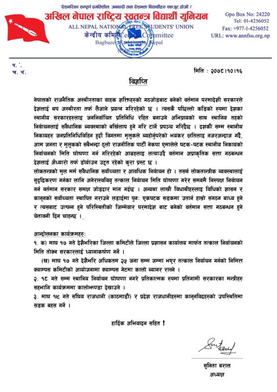 अध्यक्ष सुनिता बरालद्वारा हस्ताक्षरित विज्ञप्तिमा सरकार विरुद्ध कडा रुपमा आन्दोलनमा उत्रिन अपिल गरिएको छ ।