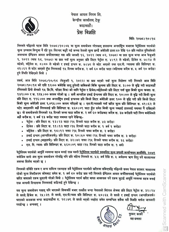 यस्तै निगमले हवाई इन्धन आन्तरिकतर्फ प्रतिलिटर १० रुपैयाँ र अन्तर्राष्ट्रियतर्फ प्रतिकिलोलिटर १०० अमेरिकी डलर बढाइएको जनाएको छ । ग्यासको मूल्य भने यथावत राखेको निगमले जनाएको छ ।