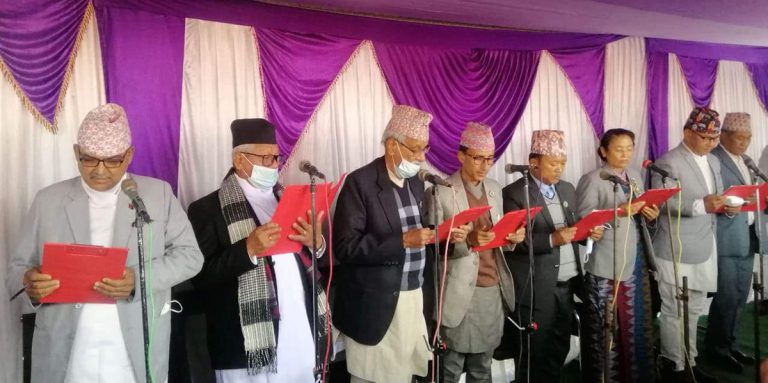 प्रदेश प्रमुख खापुङले रामकुमार राईलाई खानेपानी, सिँचाइ तथा ऊर्जा, राजन राईलाई सामाजिक विकास मन्त्रालय, खिनु लङ्वा लिम्बूलाई पर्यटन तथा सस्कृति, झलकबहादुर मगरलाई कृषि, शेखरचन्द्र थापालाई वन, वातावरण तथा भू–संरक्षण, ओमप्रकाश सरावगीलाई भूमि व्यवस्था, सहकारी तथा गरिबी निवारण, प्रताप प्रकाश हाङगामलाई उद्योग, श्रम तथा रोजगार र उपेन्द्रप्रसाद घिमिरेलाई यातायात व्यवस्था तथा सञ्चारमन्त्रीमा आज पद तथा गोपनियनताको शपथ गराउनुभयो ।