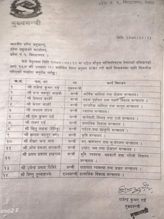 प्रदेश प्रमुख खापुङले मुख्यमन्त्री राजेन्द्रकुमार राईको सिफारिमा विसं २०७८ कात्तिक १६ गते गठित मौजुदा मन्त्रिपरिषद्लाई नेपालको संविधानको धारा १६८ को उपधारा ९९० बमोजिम नियुक्ति, हेरफेर र कार्य विभाजन गर्नुभएको हो ।