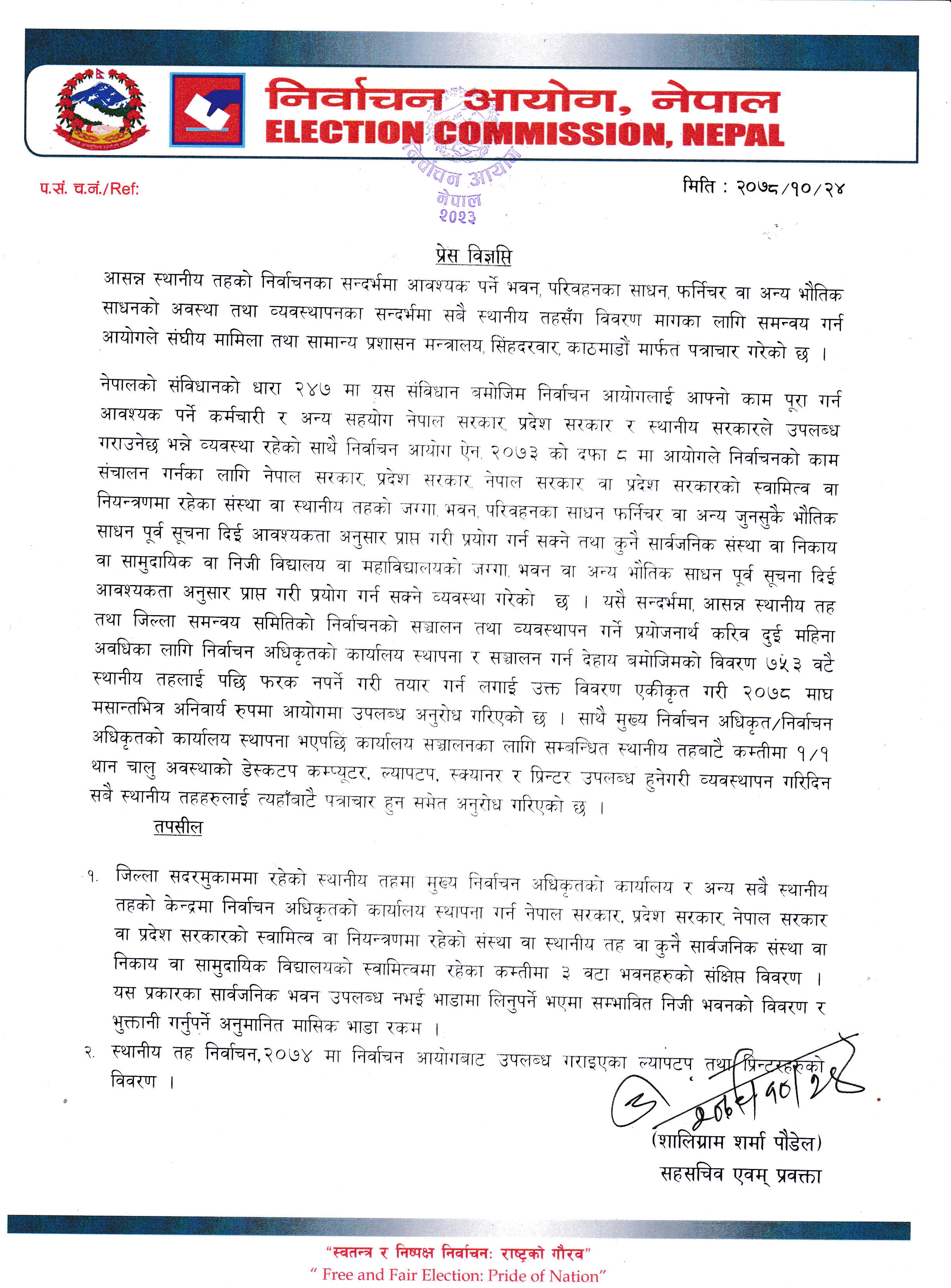 त्यस्तै मुख्य निर्वाचन अधिकृत/निर्वाचन अधिकृतको कार्यालय स्थापना भएपछि कार्यालय सञ्चालनका लागि सम्बन्धित स्थानीय तहबाटै कम्तीमा १/१ थान चालु अवस्थाको डेस्कटप कम्प्यूटर, ल्यापटप, स्क्यानर र प्रिन्टर उपलब्ध हुने गरी व्यवस्थापन गरिदिन सबै स्थानीय तहहरुलाई त्यहाँबाटै पत्राचार हुन समेत अनुरोध गरिएको छ’, प्रवक्ता शालिग्राम शर्मा पौडेलले सोमबार जारी गरेको विज्ञप्तिमा भनिएको छ।