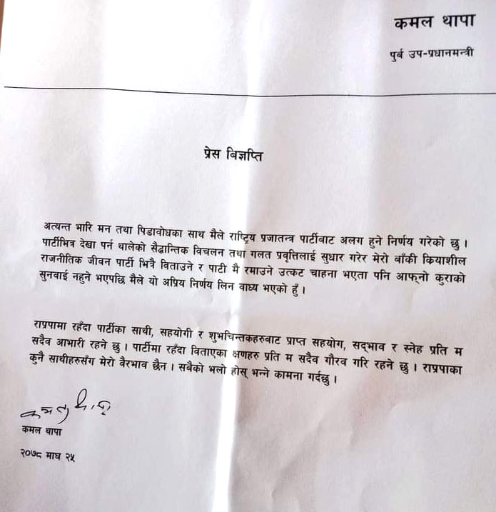 पत्रकार सम्मेलनमा थापाले भन्नुभयो, ‘अत्यन्त भारी मन तथा पीडाबोधका साथ मैले राष्ट्रिय प्रजातन्त्र पार्टीबाट अलग हुने निर्णय लिएको छु । पार्टीभित्र देखा पर्न थालेको सैद्धान्तिक विचलन तथा गलत प्रवृत्तिलाई सुधार गरेर मेरो बाँकी क्रियाशील राजनीतिक जीवन पार्टीभित्रै बिताउने र पार्टीमै रमाउने उत्कट चाहना भएतापनि आफ्नो कुराको सुनुवाइ नहुने भएपछि मैले यो अप्रिय निर्णय लिन बाध्य भएको हुँ ।’