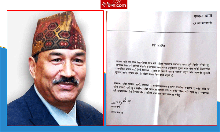 मकवानपुर – राष्ट्रिय प्रजातन्त्र पार्टी (राप्रपा) का पूर्वअध्यक्ष कमल थापाले राप्रपाबाट अलग हुने घोषणा गर्नु भएको छ । हेटौडामा आज पत्रकार सम्मेलन गरेर थापाले पार्टीबाट अलग हुने घोषणा गर्नु भएको हो ।
