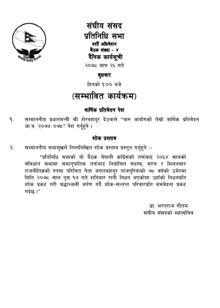 यस्तै, सभामुख अग्नी सापकोटाले सभासद जगतबहादुर ताजपुरियाको निधनमा शोक प्रस्ताव प्रस्तुत पेश गर्नुहुने छ।