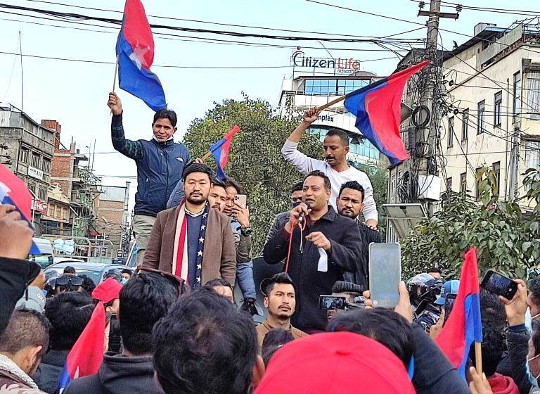 प्रदर्शनमा सहभागी युवा संघका कार्यकर्ताले ‘स्थानीय तह निर्वाचनको स्वीकार्यता, मुल्यवृद्धि फिर्ता गर, नेपाली भूमि फिर्ता, रेणु यादवलाई बर्खास्त गर, खोप चोरी प्रकरणको छानविन गर, स्वास्थ्यमन्त्रीलाई कारवाही गर’ लगायतका माग राख्दै युवा संघले नाराबाजी गरेका थिए।
