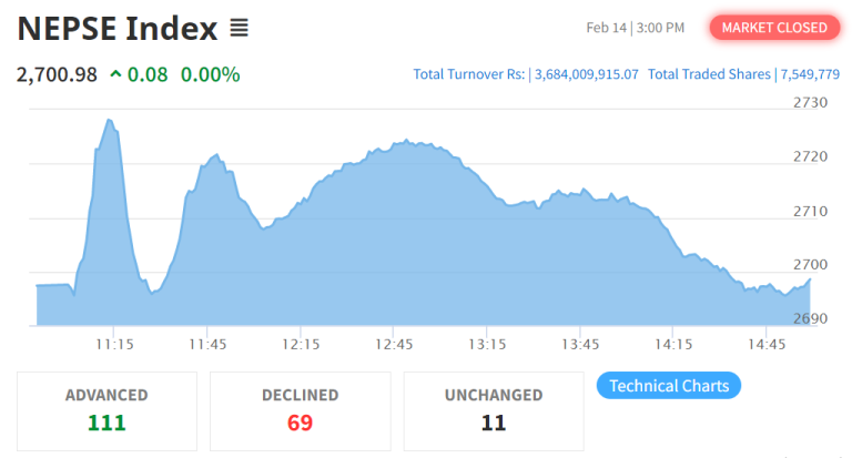 काठमाडौं – धितोपत्र बजारमा शेयर कारोबार मापक नेप्से परिसूचक आज झिनो अङ्कले उकालो लागेको छ । नेपाल स्टक एक्सचेञ्जका अनुसार कारोबार मापक नेप्से परिसूचक ०.०८ अङ्कले उकालो लागेर दुई हजार ७००.९८ मा पुगेको छ ।